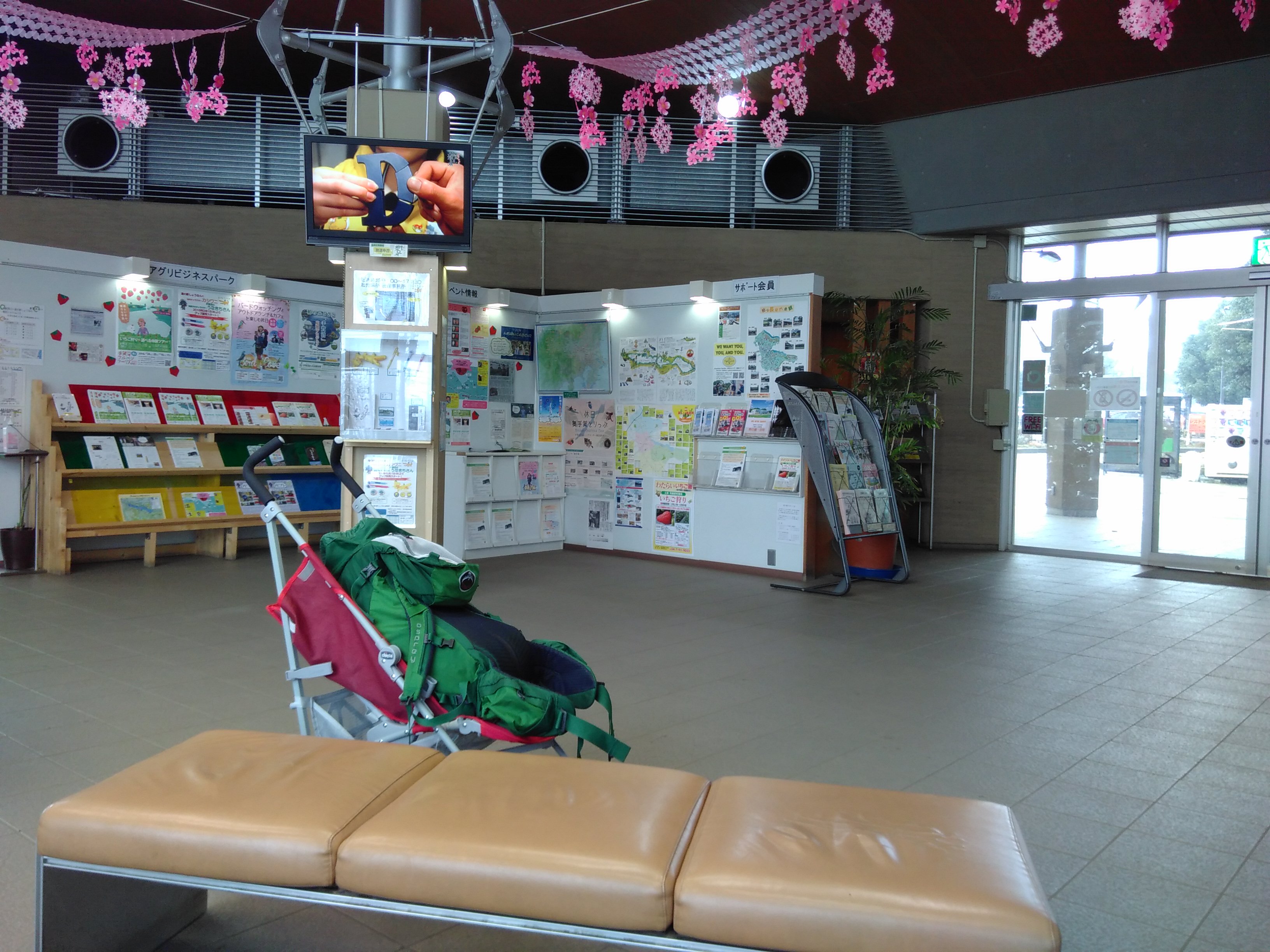 Dann folge ich meiner Familie, die umgezogen und gewaschen ist. In dem Gebäude sind in diesem Fall ein kleiner Supermarkt, ein Bistro und die beheizten Toiletten. ノナ und ich hampeln im Vorraum, während カキ noch Zeug aus dem Auto holt.
