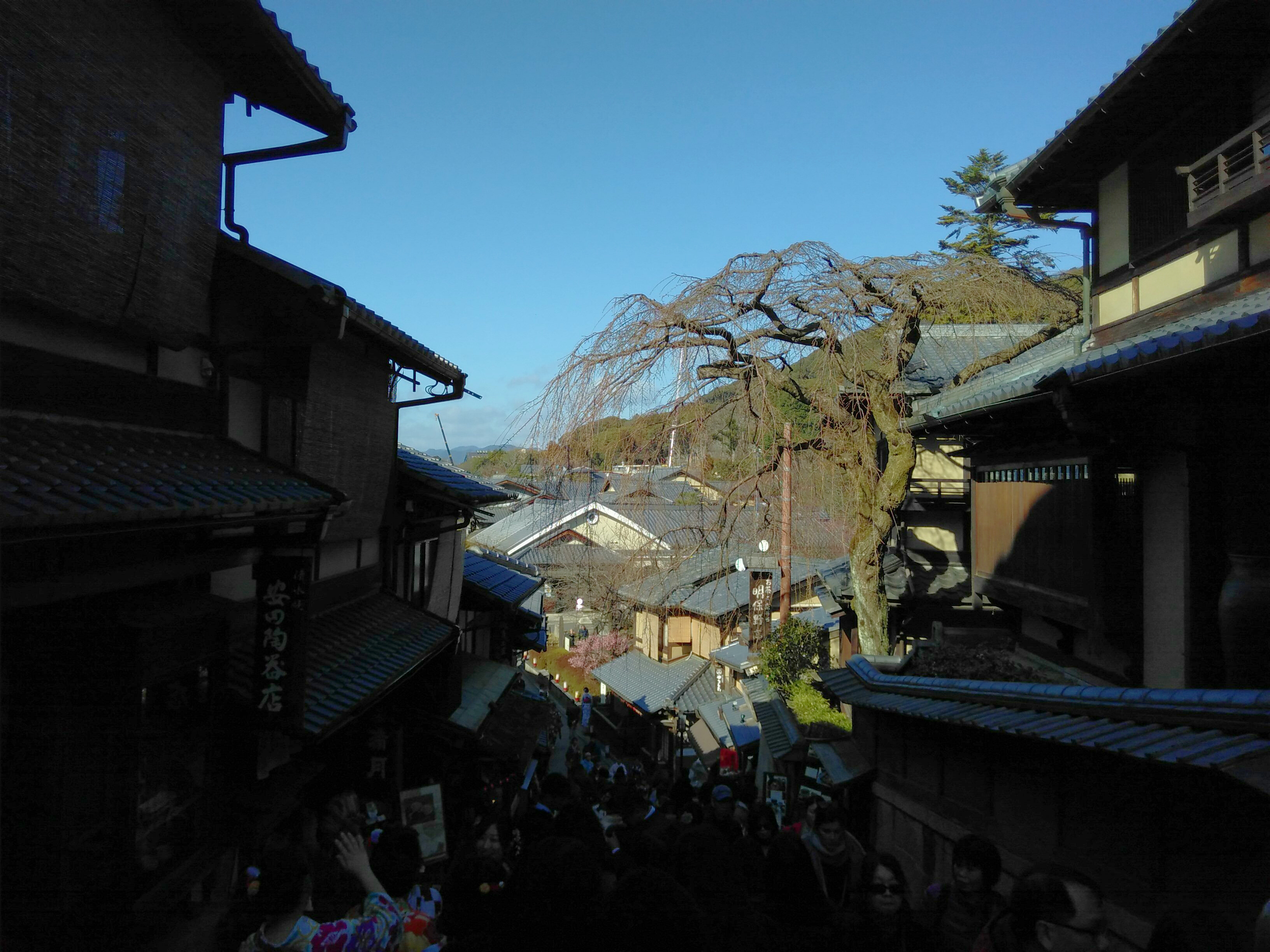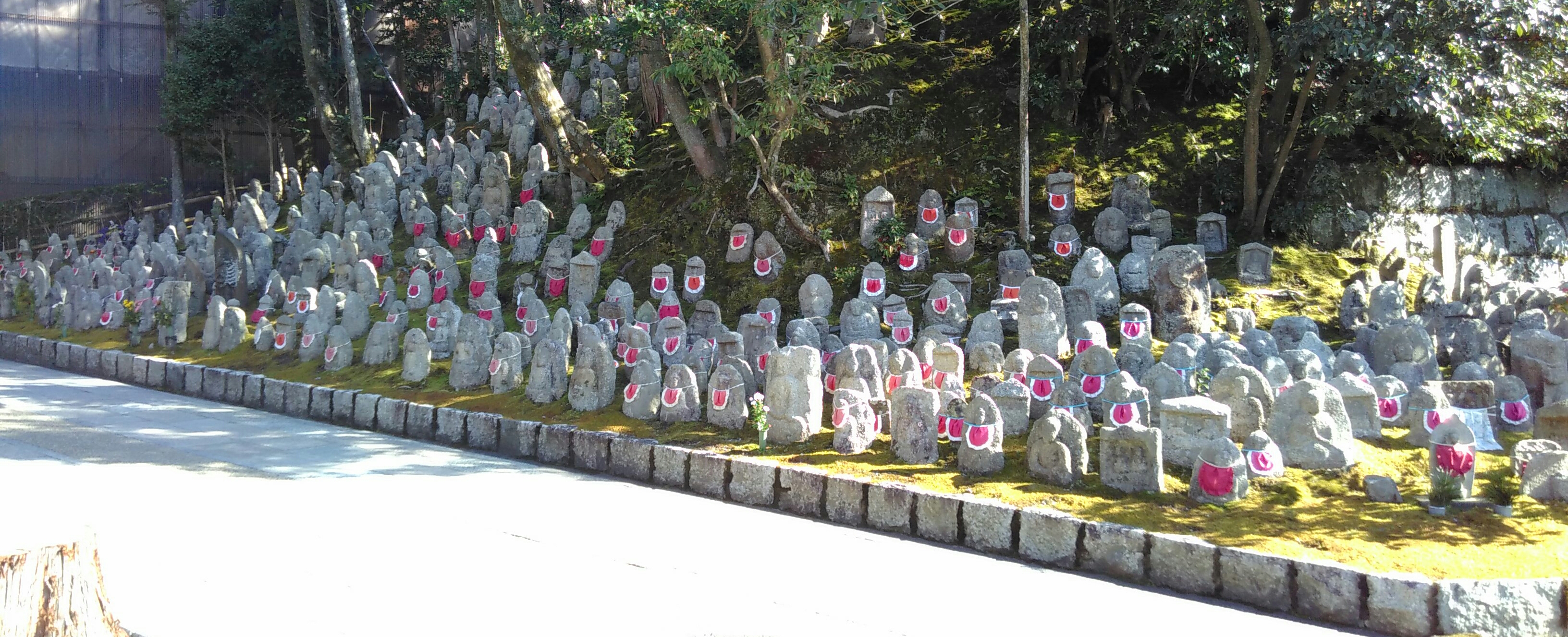 Mit dem Zug zurück zum Hauptbahnhof. Dann erklimmen wir wieder einen der Hügel am Stadtrand, diesmal zum Kiyomizudera, dem "Tempel des Reinen Wassers". Es wimmelt von japanischen Touristen. Die berühmte Terrasse ist leider verhüllt. Viel wird restauriert. Dafür sehen wir eine Herde Buddha-Statuen.