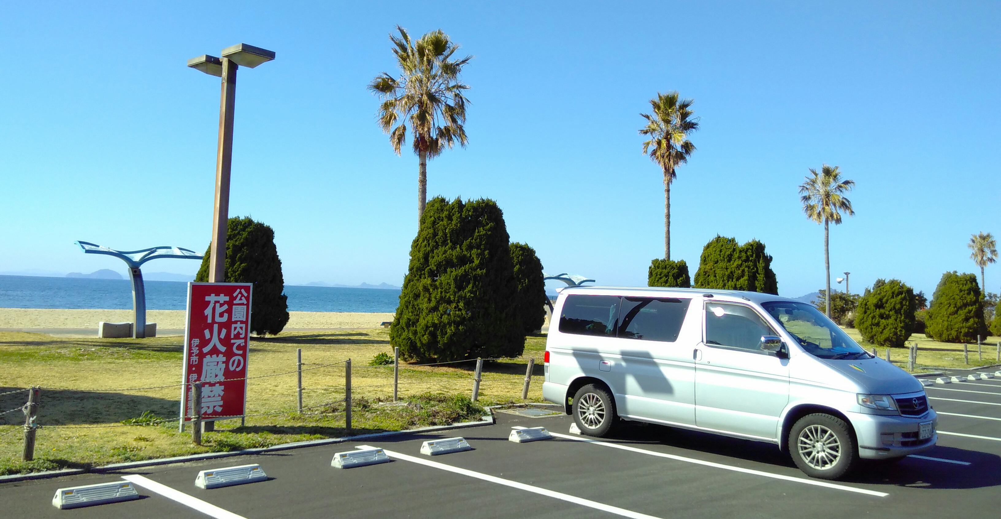 Dann schläft das Monster wieder, und wir fahren weiter. Wir wollen morgen Matsuyama anschauen und suchen uns einen Platz in der Nähe. In Iyoshi finden wir einen schönen Platz am Strand.
