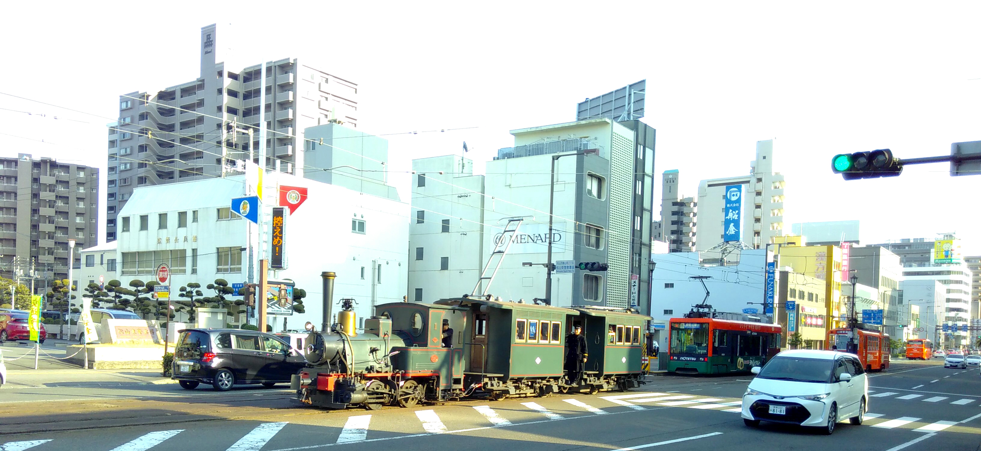 カキ und ノナ gehen in den Onsen (ノナ zeigt sich wieder von seiner besten Seite), モキ bewundert die älteste Eisenbahn Japans (Krauss, ein Import aus Deutschland), die jetzt als Trambahn durch die Stadt schaukelt.