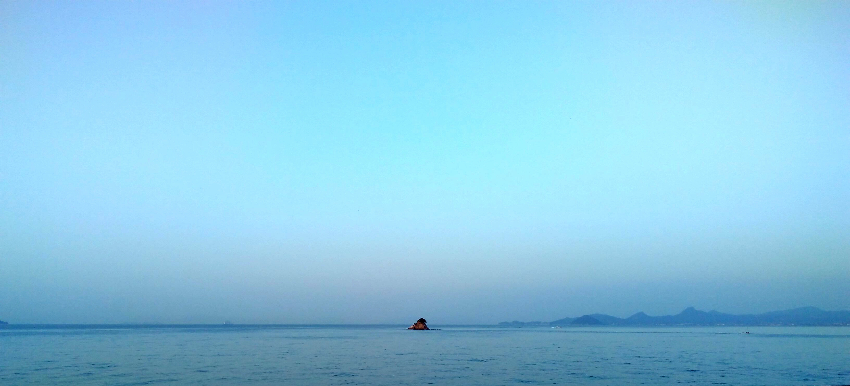 Dann ist es schon wieder fünf, und wir wollen zum Abendessen an unserem Schlafplatz sein. Also wurschteln wir uns durch den Berufsverkehr zum Hafen, wo wir planen morgen eine Fähre nach Hiroshima zu besteigen. Mit dem Auto bräuchten wir erheblich länger, und müssten auch wieder Maut für Brücken zahlen. Wir finden einen Platz am Meer, auch wenns bisl muffig riecht. Dafür haben wir unsere eigene kleine Insel.