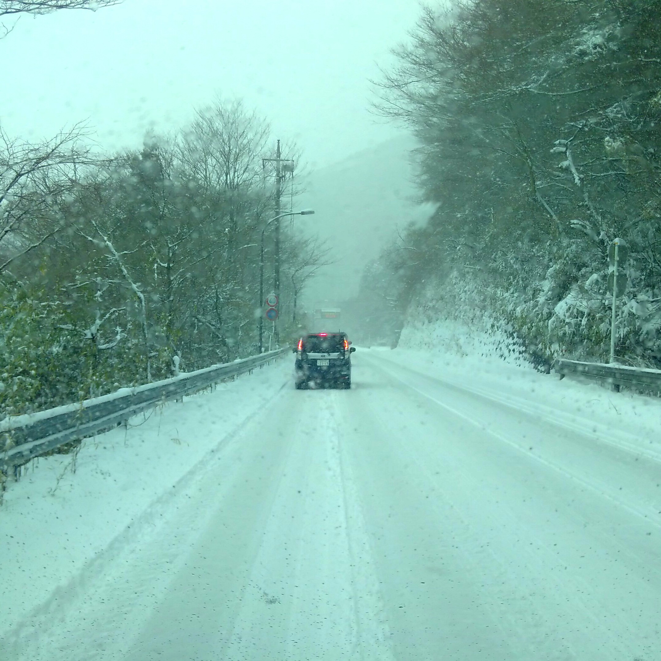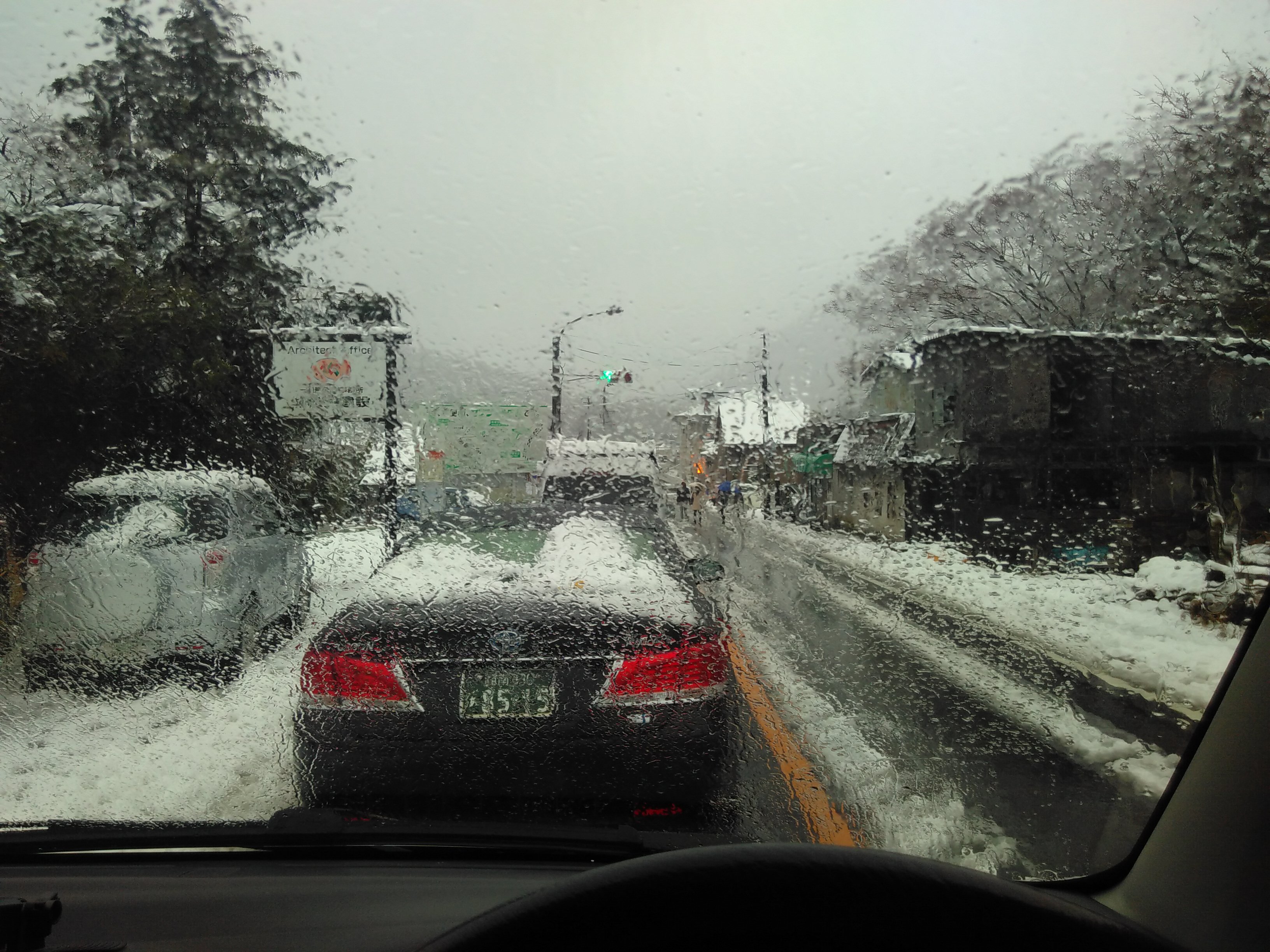 Wir beschließen, nicht wie geplant nach Owakudani, sondern sicherheitshalber in das tiefer gelegene Miyagino (Gora) zu fahren. Mangels Alternativen peilen wir einen 7eleven an. Gerade als zumindest der Schnee auf den Straßen wieder zu schmelzen beginnt, etwa 100m vor dem Ziel, stehen wir plötzlich. Nix geht mehr für etwa eine dreiviertel Stunde.
