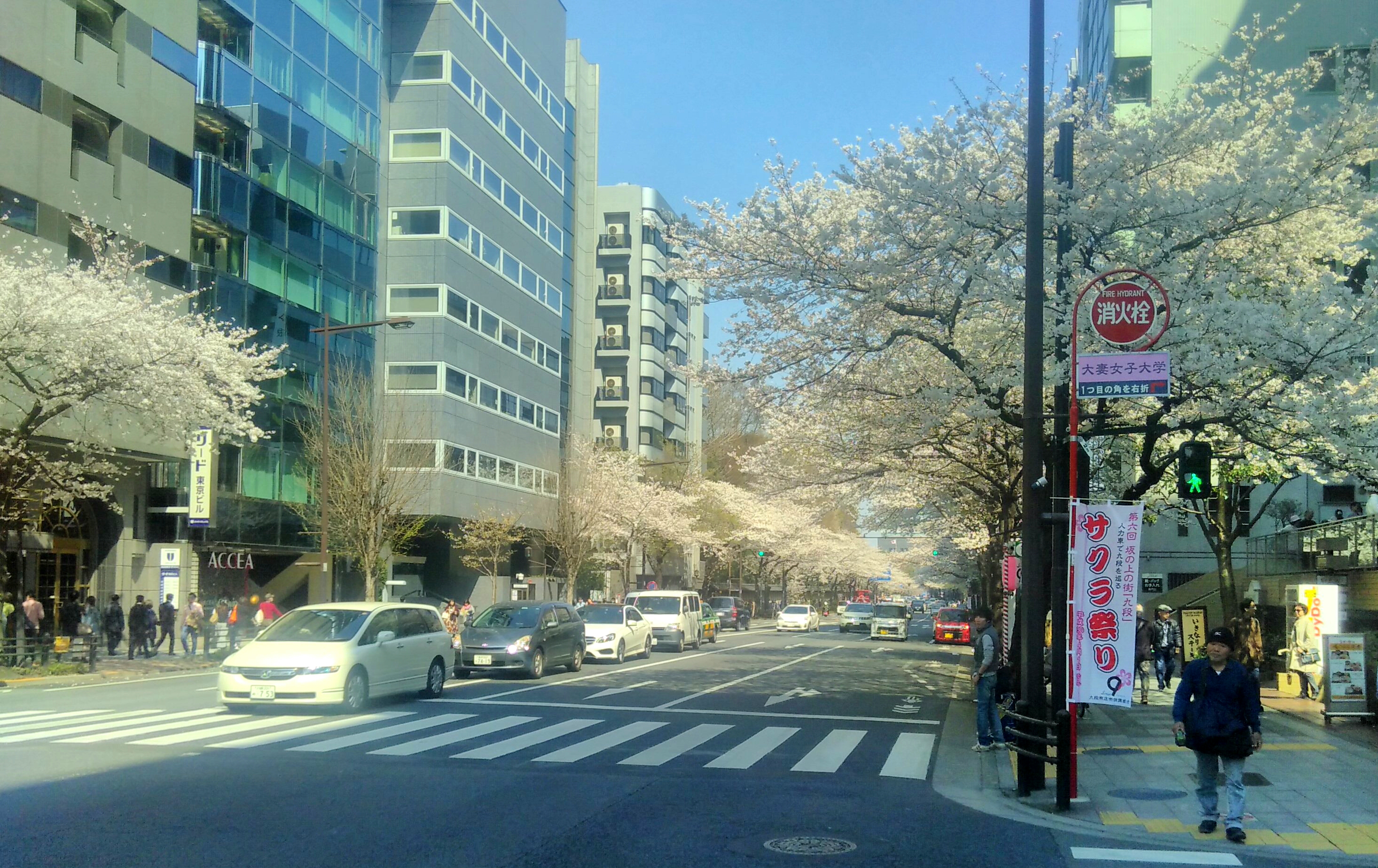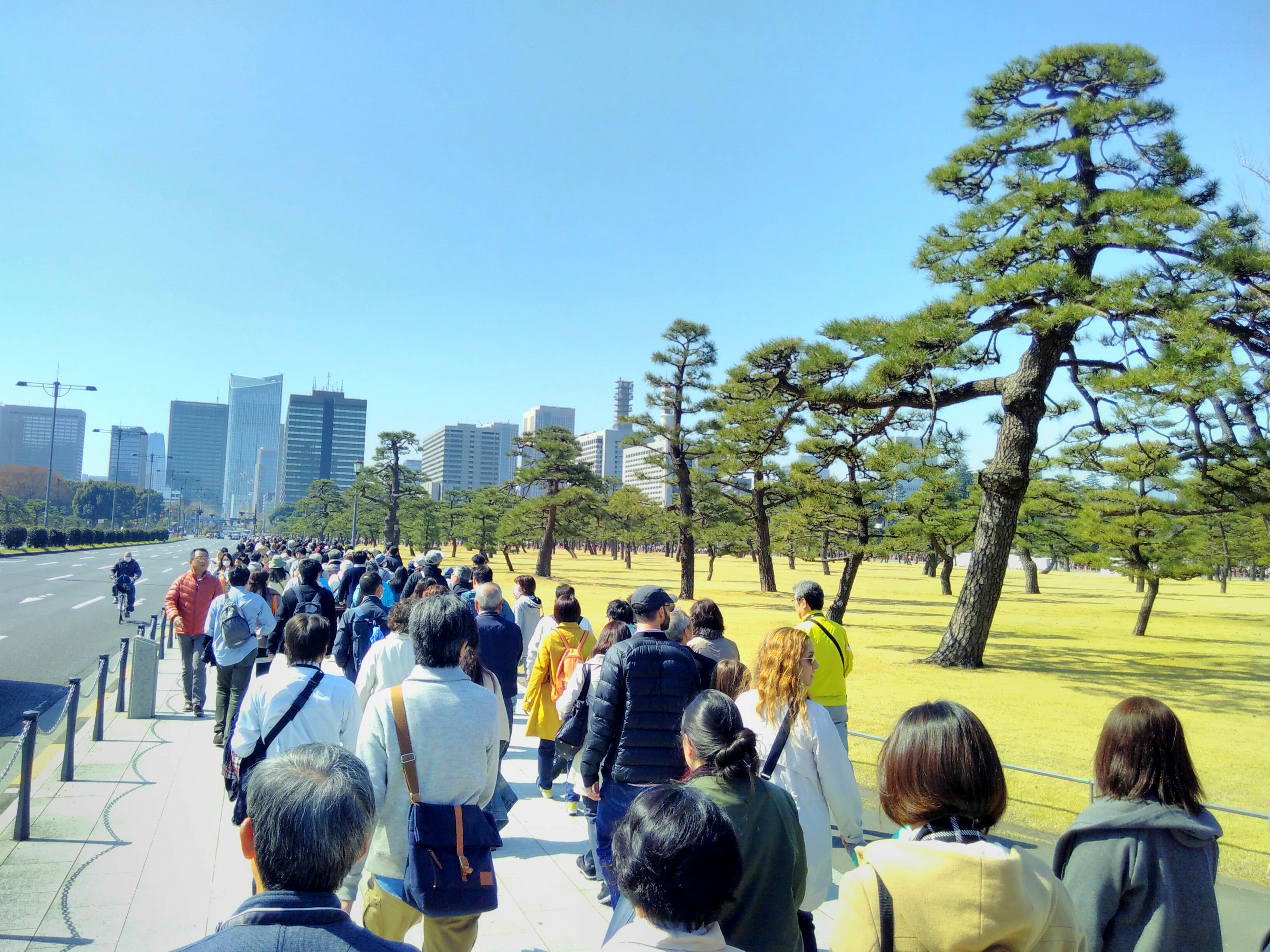 (Die Menschenschlange windet sich um den Park, rechts hinter den Bäumen kann man sie ganz klein noch sehen!) Entweder ist hier ein Event, oder es ist der ganz normale Kirschblüten-Sonntags-Wahnsinn – so oder so, wir versuchen es morgen wieder.